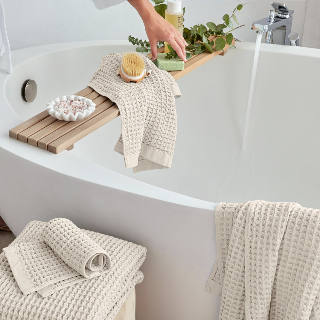 • Space saving: 30% lighter & 50% less bulky than other cotton towels thanks to the airy curves of the open weave.